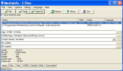 Такую информацию, как: название, автор, режиссер, альбом, номер звуковой дорожки, дата, продолжительность, кодек, отношение сторон, частота кадров, язык субтитров и пр. Программа также позволяет экспортировать информацию.