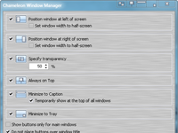Небольшая бесплатная утилита Chameleon Window Manager предназначена для удобного управления окнами приложений. После установки этой программы в углу окна появятся дополнительные кнопки управления. С их помощью можно будет быстро передвигать окно к правому или левому краю рабочего стола, одним щелчком мыши менять прозрачность активного окна приложения, сворачивать окно программы в строку заголовка. Программа может сворачивать любые открытые окна программ в системный трей. Кроме того, Chameleon Window Manager может «закрепить» открытое окно, чтобы оно постоянно отображалось поверх других окон приложений. В настройках утилиты можно устанавливать точное положение окон при быстром позиционировании с помощью кнопок, задавать процент прозрачности, указывать расстояние между вспомогательными элементами управления.
