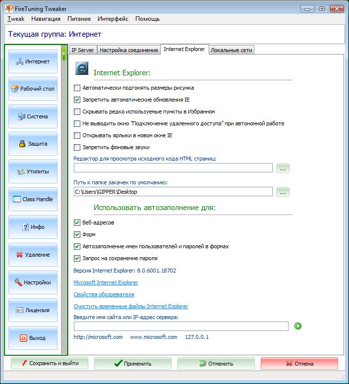 FireTuning Tweak - утилита для настройки, оптимизациии и защиты, а также для изменения скрытых настроек Microsoft Window XP и Windows Vista.Настройка Internet Explorer и соединения с интернетом, манипуляции с рабочим столом и иконками, корзиной, |